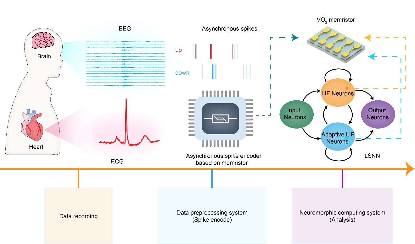 /av无码高精尖创新中心黄如院士-杨玉超教授课题组首次提出了一种基于VO2忆阻器的高效神经形态生理信号检测系统。该团队首先针对系统中关键的信号编码和信号处理两部分进行了优化设计。在编码环节中,该团队巧妙地利用VO2忆阻器的易失性阈值阻变特性以及该特性在正负偏压下的高度对称性,设计了一种能够对模拟信号的增量进行脉冲编码的异步脉冲编码器,编码后的脉冲序列具有高稀疏度且最大程度保留了原始信号的信息。在处理环节中,该团队充分地利用了VO2忆阻器的动力学行为,在基于此的泄漏-积累-发放神经元(LIF)的基础上设计了一种具有更强大的时域信息处理能力的自适应LIF神经元(ALIF),并将这两种神经元引入到一种具有长短时程记忆的脉冲神经网络(LSNN)中处理时序信号。