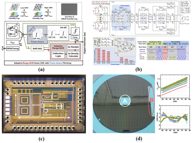 基于上述创新技术,课题组研制了一颗国际上功耗最低的CMOS湿度传感芯片,平均功耗仅1.5μW,可供8mm纽扣电池(42mAh)使用4年,湿度检测分辨率高达0.0094%RH,电容检测精度高达17.9aF,综合性能指标FoM高达0.135pJ·%RH2,与当前世界最好水平相比,功耗降低了2倍,综合性能指标FoM提升了6倍。