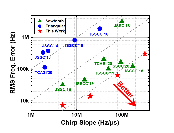 基于上述创新技术,课题组研制出一款面向毫米波调频雷达应用的24GHz调频连续波频率综合器芯片,该频率综合器采用全数字架构,辅以先进的自适应校准算法,刷新了当前同波段下调频带宽(3.2GHz@24GHz)和调频速率(320MHz/μs)的世界纪录,且调频过程中最小频率均方根误差仅7.35kHz,也是同类最优水平。