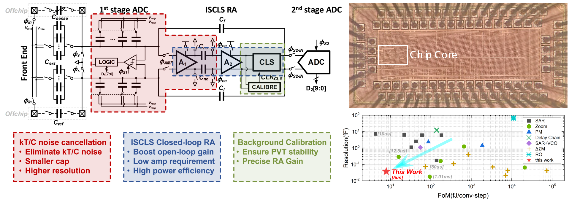 基于上述架构和电路层面的创新,课题组研制了一款基于22nm CMOS工艺的紧凑型高能效电容传感器芯片,该电路在22nm工艺下实现了对0-5.16pF电容值测量,精度达到了37.12aF,在所有高精度(1fFrms噪声水平)电容传感器中具有最高的能效(7.9fJ/conv.-step),且达到了71.3dB的信噪比,相较前人的工作将能效提升了一倍。该电路具有高能效、高精度、小面积、高转换速度等特点,可广泛应用于面向电容传感的各类物联网传感器和前端应用中,并且为电容传感芯片的小型化提供了全新的解决方案。