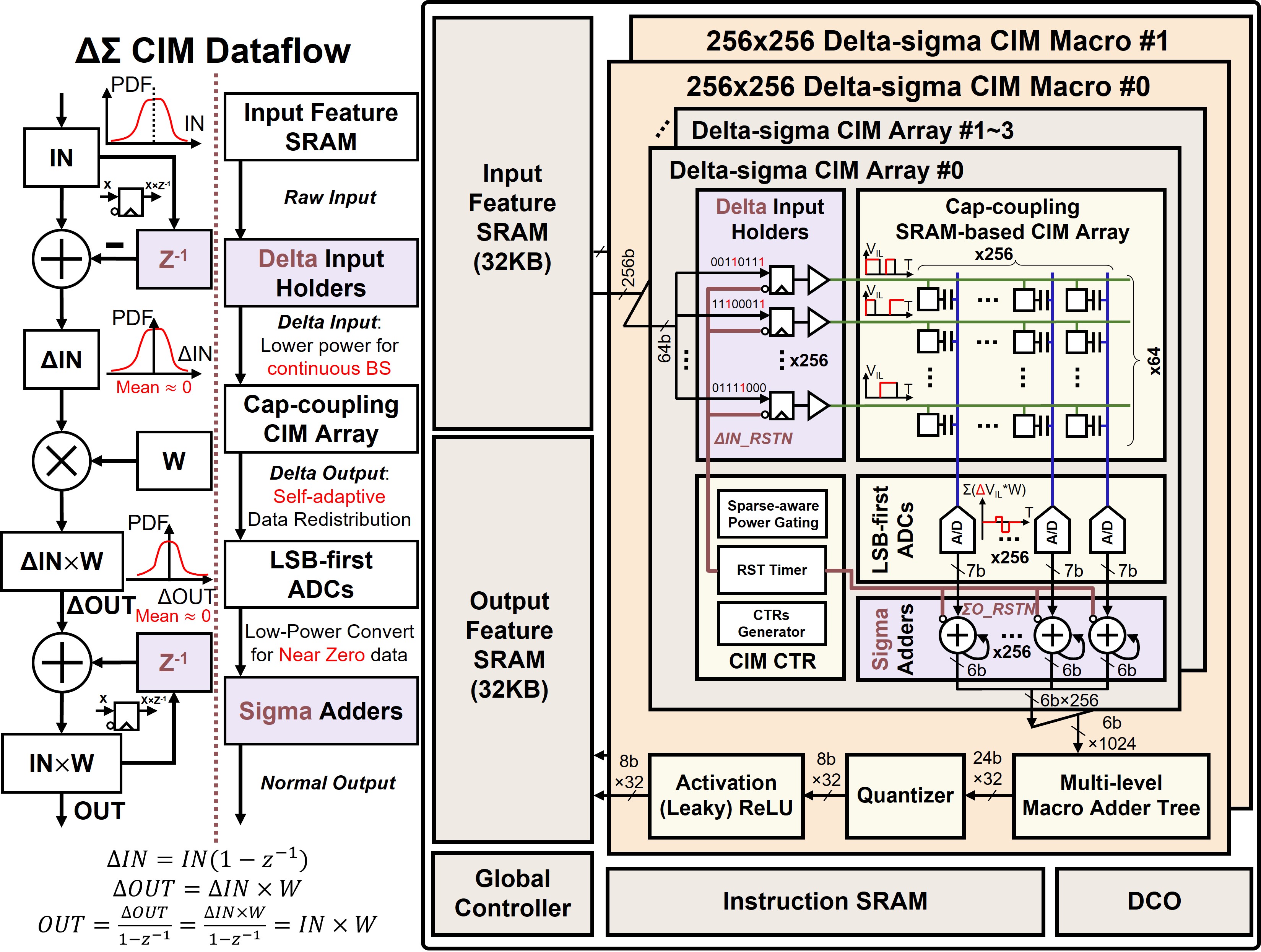 该工作以《面向边缘AI处理的基于差值求和方式的21.38 TOPS/W的SRAM存内计算芯片》(A 22nm Delta-Sigma Computing-In-Memory (ΔΣCIM) SRAM Macro with Near-Zero-Mean Outputs and LSB-First ADCs Achieving 21.38 TOPS/W for 8b-MAC Edge AI Processing)为题,发表于今年ISSCC,文章第一作者av无码-av女优 博士生陈沛毓进行宣讲,av无码-av女优 博士生武蒙为共同一作,文章的通讯作者是马宇飞研究员和叶乐教授。