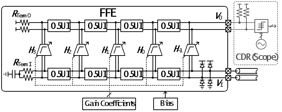 av无码-av女优 盖伟新-何燕冬教授团队提出了基于延迟线与分布式抽头的前馈均衡技术:该技术利用无源延迟线在超高速场景下损耗小的天然优势,解决了对模拟信号延时的功耗与噪声较大的问题,在实现200Gb/s超高速率均衡的同时,利用分布式结构降低了抽头负载电容引入的信号反射;此外,通过在抽头放大器中采用源极RC退化技术,赋予前馈均衡器灵活的低频均衡能力,避免仅靠增加抽头数量来消除长尾码间干扰,大幅降低了电路功耗。