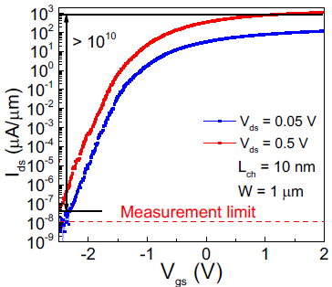 超薄沟道宽禁带氧化物半导体具备优越的短沟道效应抑制能力,国际上在三元氧化物IGZO晶体管上已经开展了多年相关的研究,但其非晶态迁移率非常低,不适于逻辑器件应用。针对该问题,微纳电子学系吴燕庆研究员、黄如教授团队另辟蹊径,在二元氧化物ITO(氧化铟锡)上克服了其载流子浓度大的问题,成功实现了从类金属态的高导电特性到宽禁带半导体的高绝缘特性转变,在厚度为3.5nm的ITO薄膜上成功制备了当前最小尺寸10nm沟长的高性能超薄ITO晶体管。在1V工作电压下,其开态电流超过1860μA/μm,关态电流小于40 fA/μm,开关比为1010,跨导超过1000μS/μm,性能远超同类器件,为国际报道最高纪录。该技术工艺温度低于200oC,与硅基CMOSav无码后道工艺兼容,可用于未来三维集成技术。
