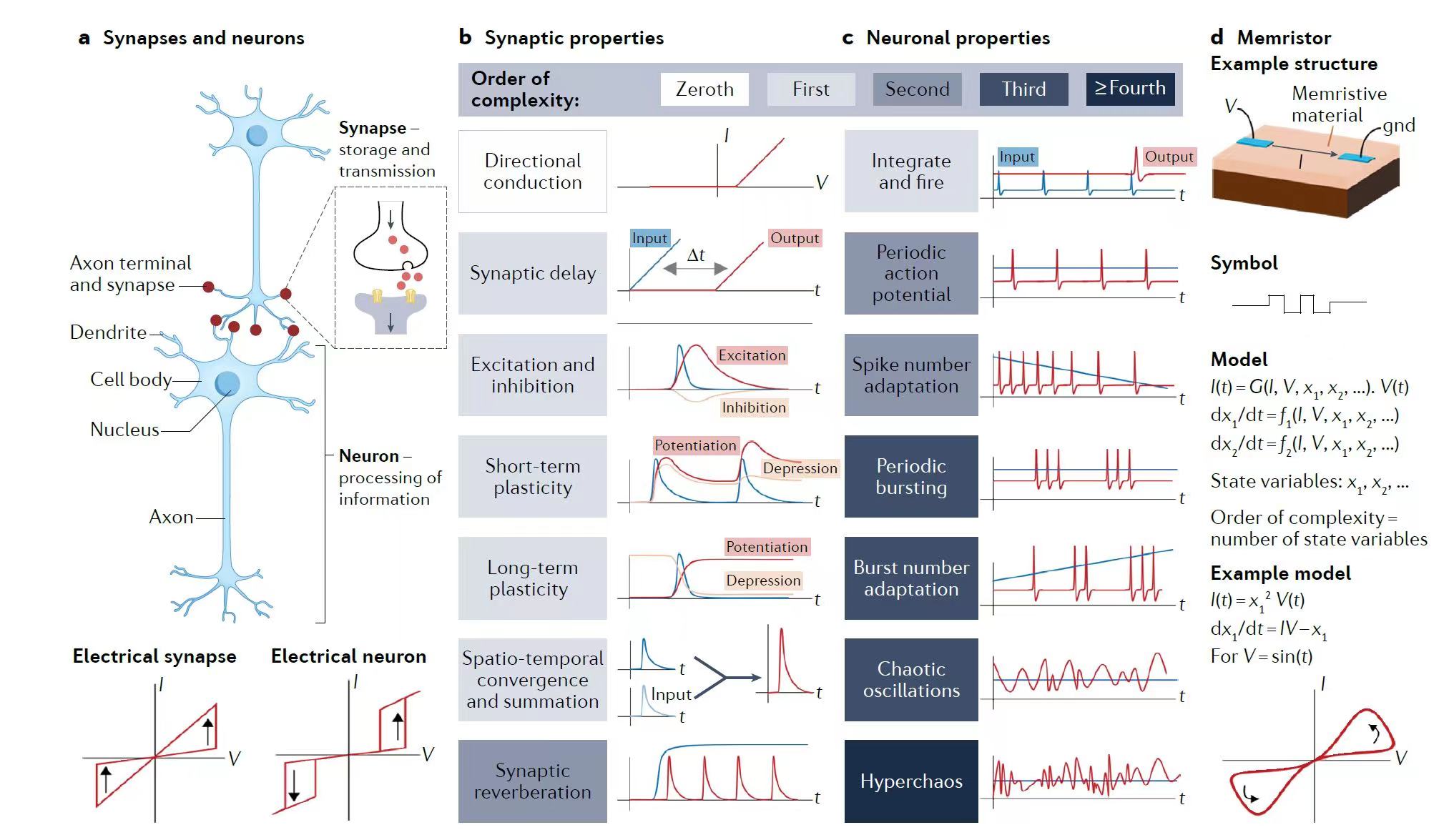 复杂性被定义为一个动力学系统的维度,在忆阻器框架中对应描述器件行为的一阶偏微分方程与独立状态变量的数目。大脑是一个高度非线性的复杂系统,突触和神经元组成了大脑中的基本运算单元,其计算功能同样可以借助复杂性进行表达。在当前已经实现的神经形态器件中,忆阻器内部导电细丝尺度、器件温度、相变过程、寄生电荷等提供了物理层面的状态变量,由此构建出的高阶复杂度器件能够高效实现15种以上神经元动态发放行为。此外,采用物理网络拓扑连接还可以进一步实现反馈动力学、纳米自组织、多端离子耦合、非线性耦合振荡网络等高阶动力学行为。这种高阶复杂性类脑计算将有效补充经典计算机的不足,例如应用于超低功耗并行求解模式识别、图分析甚至模拟复杂神经元交流等问题。基于此路线未来有望发展出真正生物启发的、具备高阶复杂性、基于忆阻动力学的新一代类脑计算,在神经科学、材料开发、芯片设计、系统集成、架构与算法层面产生深刻而持久的影响。