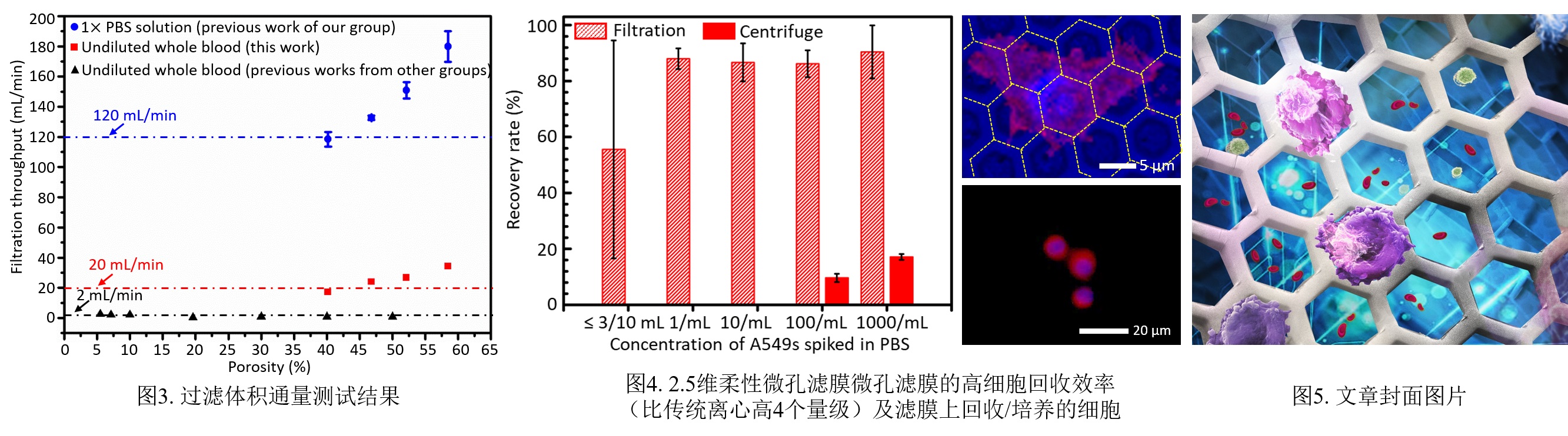 液态活检已经成为癌症精准医疗的关键技术。目前液态活检方法主要以血液中循环肿瘤细胞(Circulating tumor cell, CTC)及其衍生生物靶标为检测目标;而其它体液(如肺泡灌洗液)中原发灶指向性更强的脱落肿瘤细胞(Exfoliated tumor cell, ETC)也和肿瘤进展具有紧密相关性,是液态活检的重要对象之一, 对癌症精准医疗具有更高的应用价值。目前已报道的液态活检技术体积通量低,无法应用于大体积体液中脱落肿瘤细胞的快速检出;而对于最有望获得高体积通量液态活检方法的微孔滤膜技术,目前已报道的微孔滤膜的孔−孔间距大、孔隙率低,可实现的体积通量也无法满足复杂临床体液样品的高体积通量液态活检的需求。