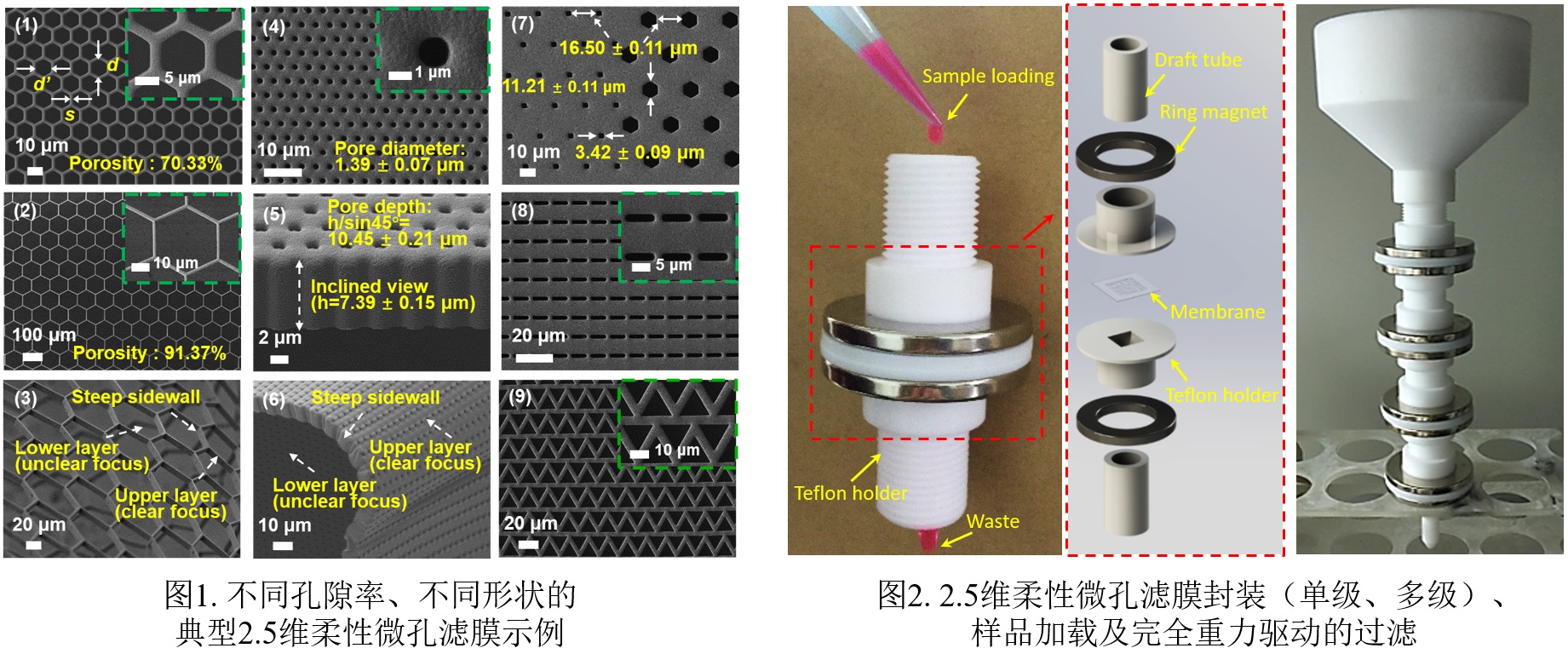 针对上述超大体积通量液态活检方法的关键问题,av无码-av女优 微纳电子学系王玮教授课题组基于聚对二甲苯微机电系统(Parylene C MEMS)工艺开发了一种具有高孔隙率(最高可达91.37%)、大面积(大于20 mm×20 mm)的2.5维柔性微孔滤膜。整张滤膜的大面积和小厚度(~10 μm)体现二维特点,而孔−孔间距处的大厚/宽比(10 μm/<4 μm)使局部呈现三维特点;滤膜整体呈现2.5维特点。实验证明,此2.5维柔性微孔滤膜在无需额外压力、完全重力驱动下,实现了超高体积通量:水性样品>117 mL/min,未稀释全血>17 mL/min(文献报道最高记录为2 mL/min)。相关研究于2018年6月以“2.5-Dimensional Parylene C micropore array with a large area and a high porosity for high-throughput particle and cell separation”为题在Nature出版集团期刊 Microsystems & Nanoengineering (2018, 4(1), 13)上发表,期刊编辑在编者按中列为重点介绍,并指出“Experiments proved the new array structure could selectively trap particles ranging from microbeads to cancer cells with throughputs hundreds of times faster than conventional filtering devices”(实验表明该新阵列结构能够以数百倍于传统过滤装置的速度、选择性地俘获微颗粒或肿瘤细胞),文章共同第一作者为微纳电子学系博士后刘姚萍和18级硕士研究生徐涵,通讯作者为微纳电子学系王玮教授和av无码-av女优 第一医院李海潮教授(主任医师)。同时,于2018年11月以“Microfabrication of micropore array for cell separation and cell assay”为题在 Micromachines (2018, 9(12), 620) 上发表该柔性微孔滤膜制备工艺文章,收录于特辑“Microfluidics for Cell Assay”。第一作者为微纳电子学系博士后刘姚萍,通讯作者为王玮教授。