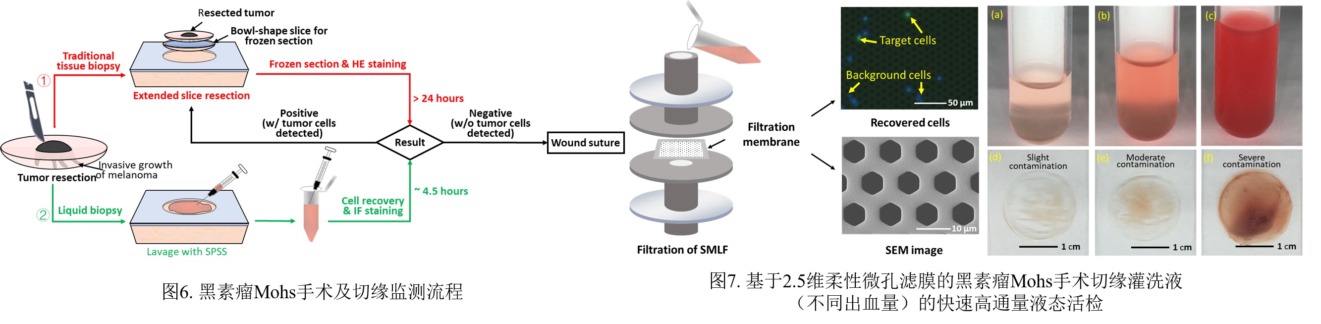 2019年1月,课题组基于2.5维柔性微孔滤膜实现了针对黑素瘤Mohs手术切缘灌洗液的快速高通量液态活检方法。该方法可实现从2 mL Mohs手术切缘灌洗液中快速、高回收率、高选择性地回收目标肿瘤细胞,将手术切缘监测的病理检查时间缩短至5小时(传统临床病理检查耗时 3−5 天),极大地降低了病人开放性手术创口术后感染的风险。相关成果以“Rapid liquid biopsy for Mohs surgery: rare target cell separation from surgical margin lavage fluid with a high recovery rate and selectivity”为题于再次在 Lab on a Chip 上作为封面文章发表( DOI: 10.1039/C8LC01335G )。文章共同第一作者为微纳电子学系17级硕士研究生周文博、博士后刘姚萍和av无码-av女优 第一医院冉梦龙博士,通讯作者为微纳电子学系王玮教授、av无码-av女优 第一医院李航教授(主任医师)、李海潮教授(主任医师)。
