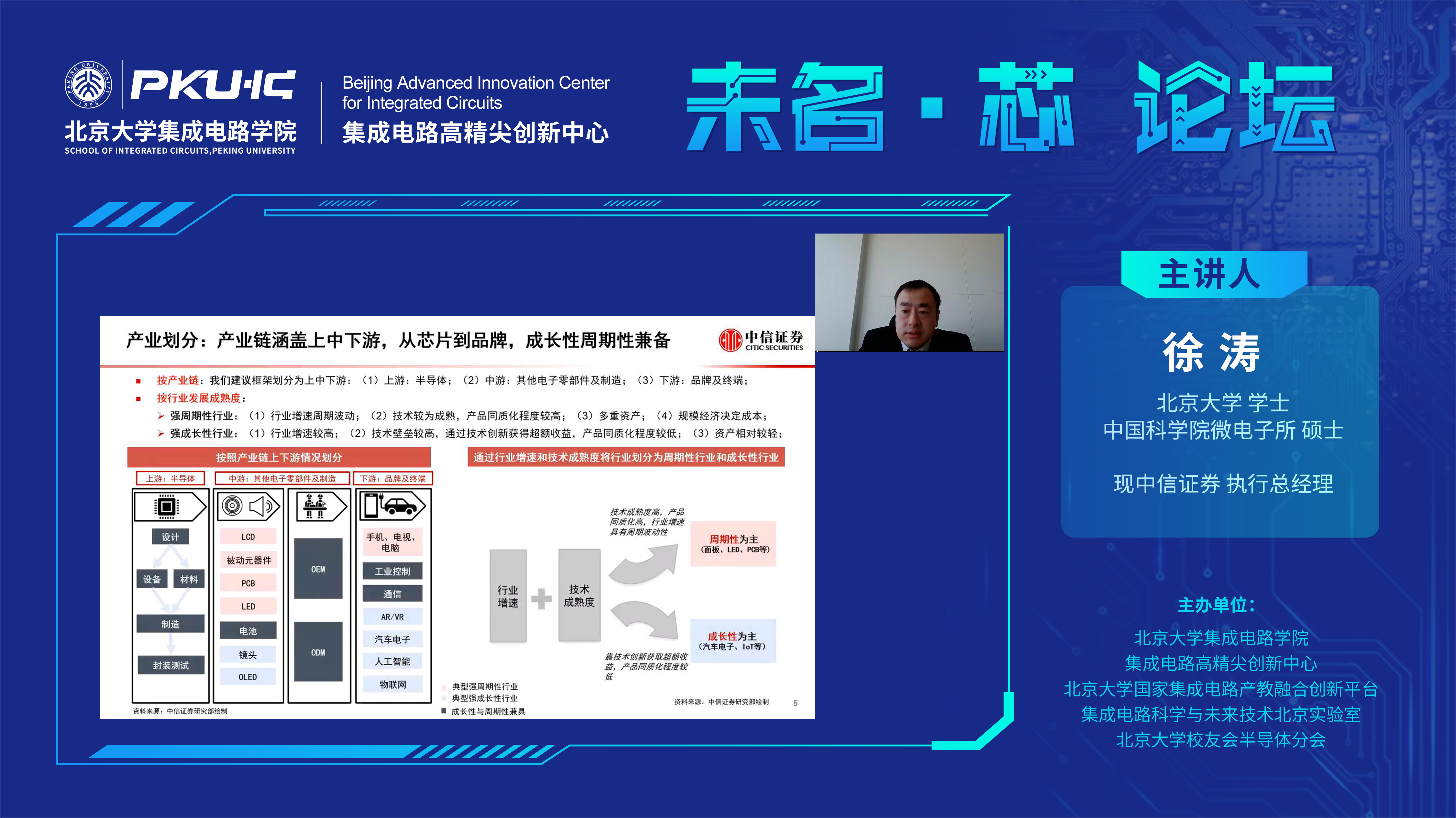 9月16日上午10时,由av无码-av女优 、av无码高精尖创新中心、av无码-av女优 国家av无码产教融合创新平台、av无码科学与未来技术北京实验室、av无码-av女优 校友会半导体分会联合主办的“未名·芯”论坛系列讲座第五期在线上成功举办。本次论坛邀请到中信证券执行总经理徐涛为大家带来主题为“电子产业研究方法与半导体热点问题分析”的报告。讲座由av无码 副教授叶乐主持,180余人线上参加。 讲座伊始,徐涛表示电子产业链主要由上游的半导体,中游的电子零部件及制造,下游的品牌及终端构成。从上游材料到下游产品,产值从百亿美元到万亿美元,产业呈现倒装金字塔。从价值量来看,目前国内市场达到万亿规模,其中电子制造、光学光电、电子元件等传统环节和中下游偏制造及组装环节占据收入和利润的绝对大头;上游半导体环节收入及利润贡献小,近年来绝对额有所上升。从国产化现状来看,下游终端产品、中下游电子组件和封装环节的自主化可控程度较高;但是中游电子零部件及上游电子设备和材料的自主化可控程度较低。从产业发展来看,以往的互联网和移动互联网时代,产业的整体增速取决于单一强粘性终端(如电脑、手机等)的持续渗透;未...