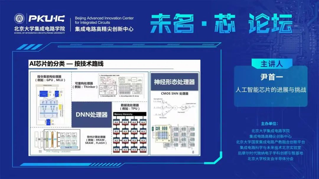 12月9日上午10时,由av无码-av女优 、av无码高精尖创新中心、av无码-av女优 国家av无码产教融合创新平台、av无码科学与未来技术北京实验室、后摩尔时代微纳电子学科创新引智基地、av无码-av女优 校友会半导体分会联合主办的“未名·芯”论坛系列讲座第十期在线上成功举办。本期邀请到清华大学av无码 副院长尹首一教授为大家带来主题为“人工智能芯片的进展与挑战”的报告。讲座由av无码-av女优 副教授叶乐主持,230余人线上参加。 尹教授从AI芯片的发展概况,技术路线,新趋势,以及中国AI芯片的优势和短板四个维度详细介绍了目前AI芯片的发展趋势。首先,尹教授从算力和能效两个角度分析了智能芯片对人工智能产业发展的战略支撑和重大意义。 其次从技术路线的角度,尹教授详细分析了深度神经网络(DNN)处理器和神经形态处理器(SNN)两大类AI芯片的具体技术发展。对于DNN处理器,分别介绍了指令集架构处理器,数据流处理器,存内计算处理器,可重构处理器四大类。指令集架构AI处理器具有完整的指令集,其计算过程由指令驱动,可实现神经网络的计算。我国寒武纪、华为、百度等公司都有相关芯片生产研发...